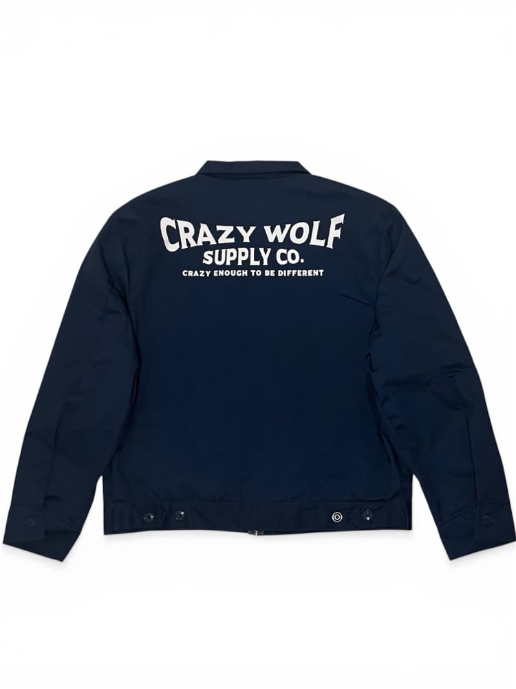 “Crazy Wolf Supply Co.” mechanic style jacket is the perfect fit for your everyday wear. With a rubber pvc patch on the left chest and a large printed back logo