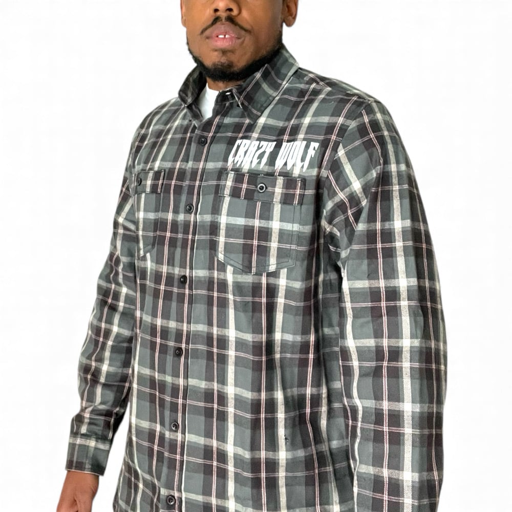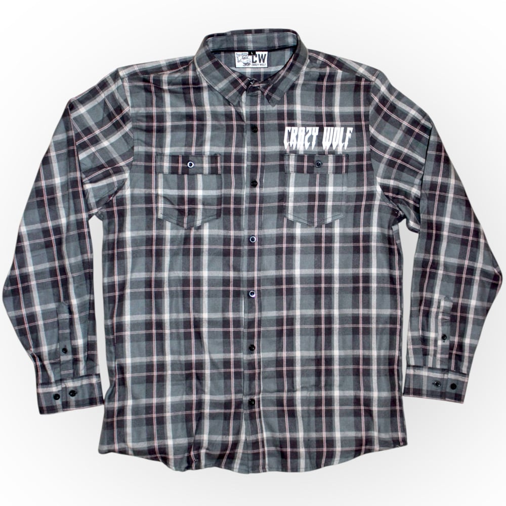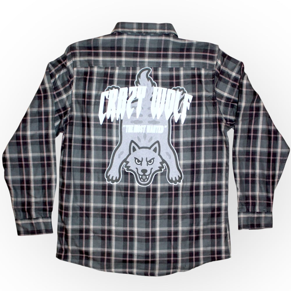 Our perfect flannel to stand out in all environments. CRAZY WOLF printed on left chest with Crazy Wolf wolf rug printed on back. Hidden button down collar. 2 open pockets with button closures. Modern fit. 6 oz.